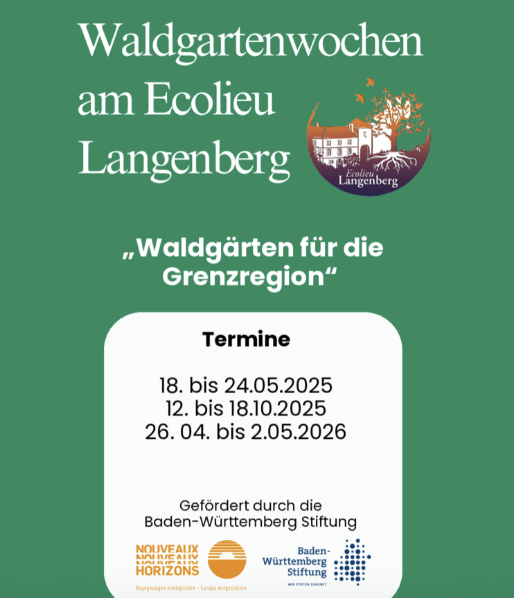 Statt 1095 Euro nur 595 Euro inklusive Verpflegung! Dank der Förderung durch die Baden-Württemberg Stiftung und durch Nouveaux Horizons im Rahmen des Programms “Waldgärten für die Grenzregion” können wir die Waldgartenwoche inklusive biologischer Vollverpflegung zum absoluten Sonderpreis von 595 Euro anbieten!